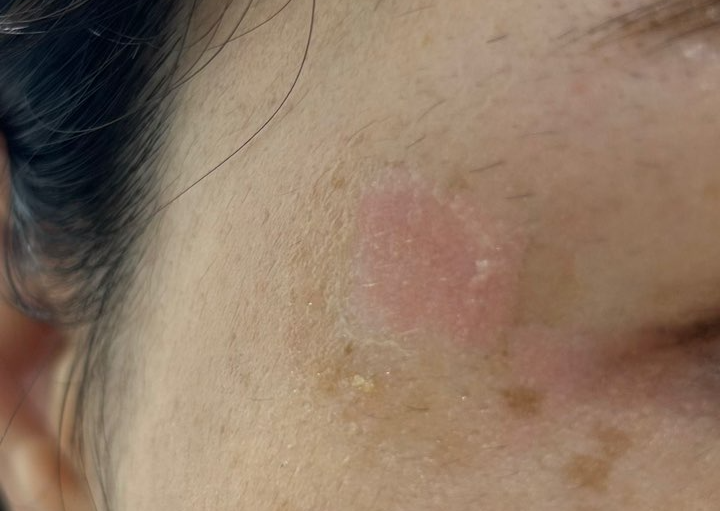 병변 부위를 흰색 연필로 그려서 그 부위만 레이저가 조사되는 방법이며 시술은 정말 10초 만에 끝났어요.