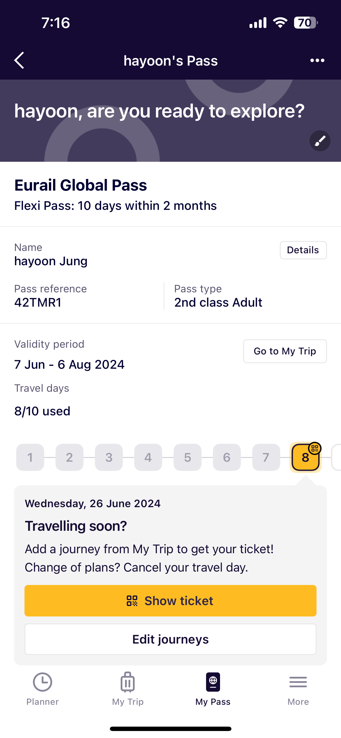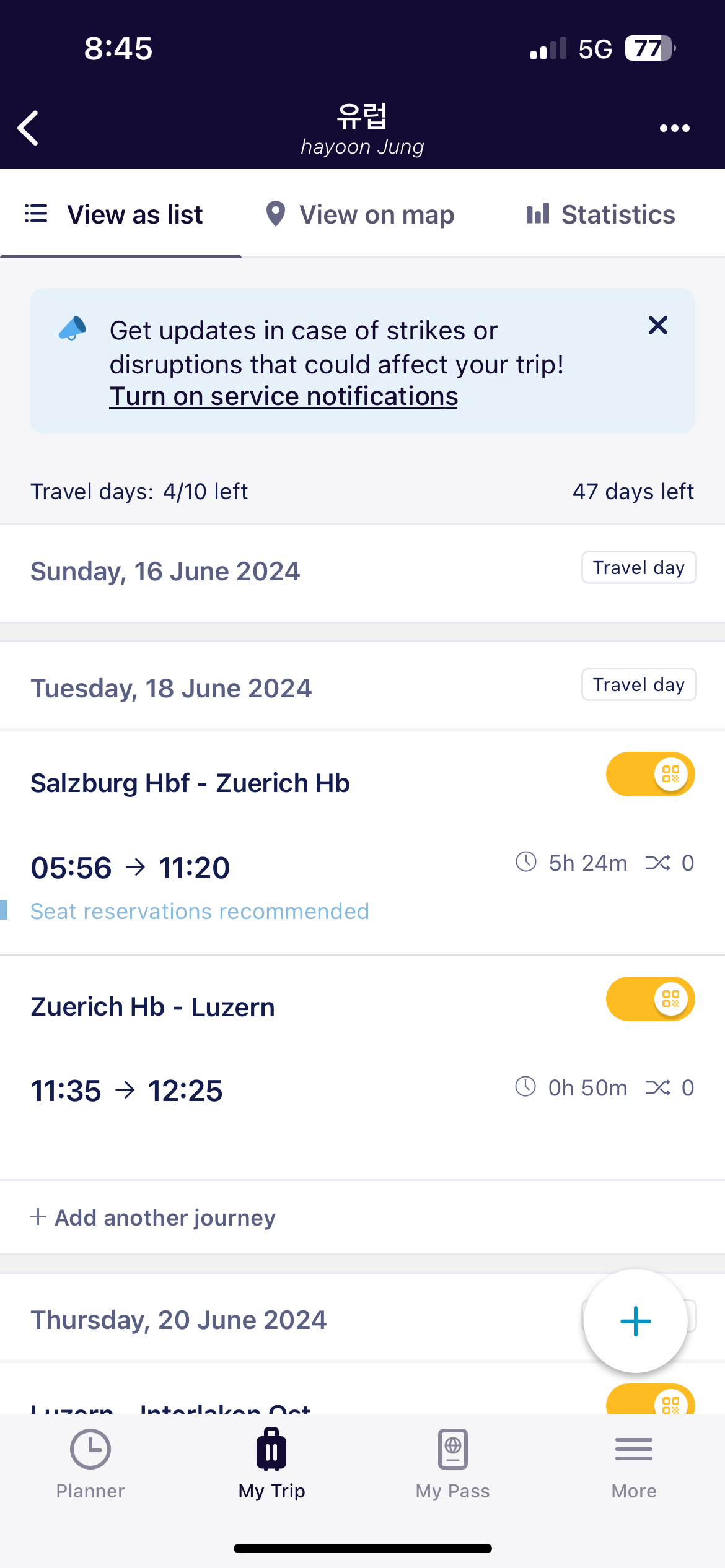 My pass에 들어가면 제가 구매한 패스의 종류, 사용가능한 날짜, 몇 회 사용하였는지 다 나와요! 검표사가 검사할 때는 아래처럼 활성화를 눌러 큐알코드를 보여주면 찍습니다. 기차표는 불시에 검사하고 제가 다니는 동안 8번 중에 7번은 검사했습니다. 그리고 보통 2등석 구매하시는 분들은 자리를 예약하고 타지 않기에 편하게 앉아서 가실 순 있지만 다른 사람들이 예약으로 타는 경우 자리를 비켜주어야 합니다. 다른 자리에 앉아서 가면 되니깐 너무 걱정하지 마시고요! 예약 필수 구간인 seat reservations required라고 쓰여있는 구간은 좌석예약 안 하면 못 타는 거예요! 그 외에는 좌석예약 안 해도 됩니다.