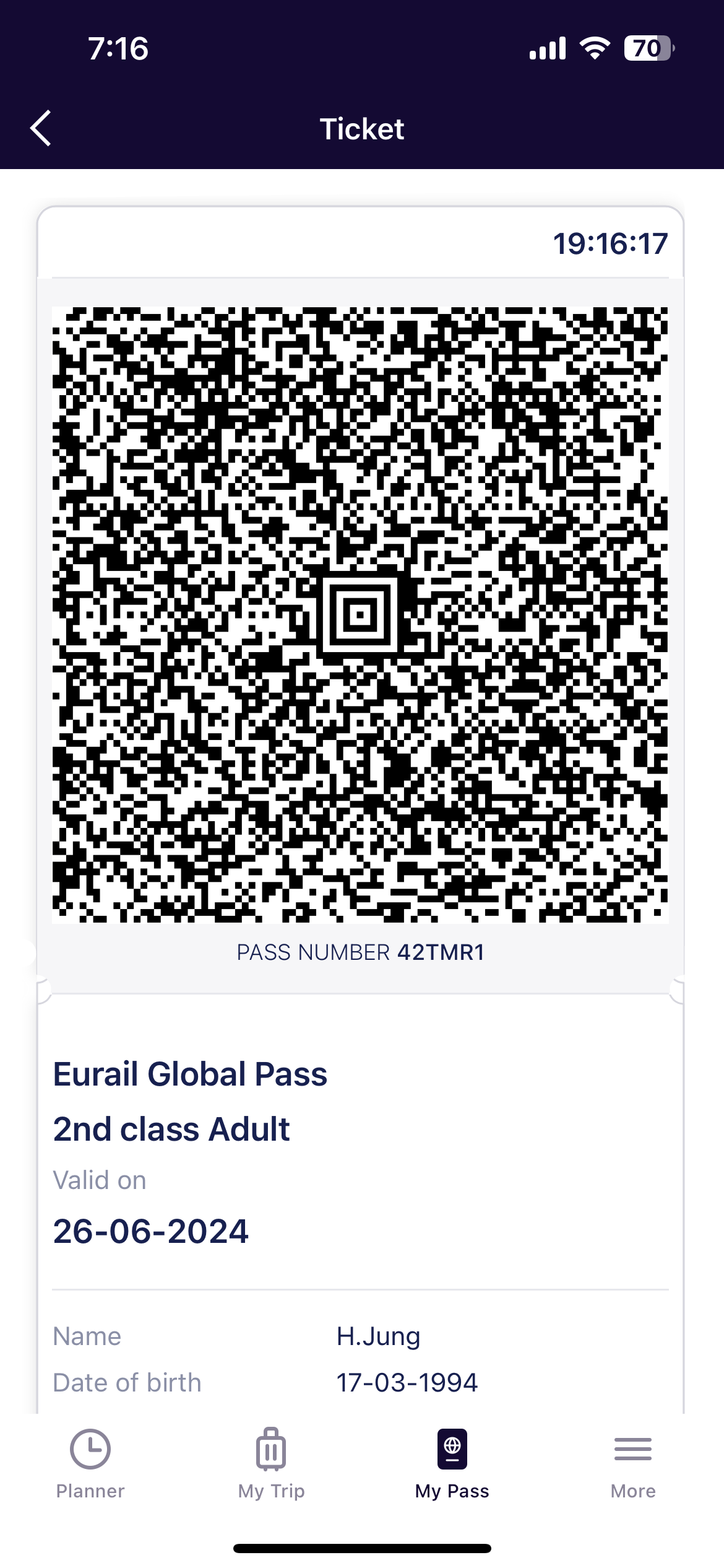 My pass에 들어가면 제가 구매한 패스의 종류, 사용가능한 날짜, 몇 회 사용하였는지 다 나와요! 검표사가 검사할 때는 아래처럼 활성화를 눌러 큐알코드를 보여주면 찍습니다. 기차표는 불시에 검사하고 제가 다니는 동안 8번 중에 7번은 검사했습니다. 그리고 보통 2등석 구매하시는 분들은 자리를 예약하고 타지 않기에 편하게 앉아서 가실 순 있지만 다른 사람들이 예약으로 타는 경우 자리를 비켜주어야 합니다. 다른 자리에 앉아서 가면 되니깐 너무 걱정하지 마시고요! 예약 필수 구간인 seat reservations required라고 쓰여있는 구간은 좌석예약 안 하면 못 타는 거예요! 그 외에는 좌석예약 안 해도 됩니다.