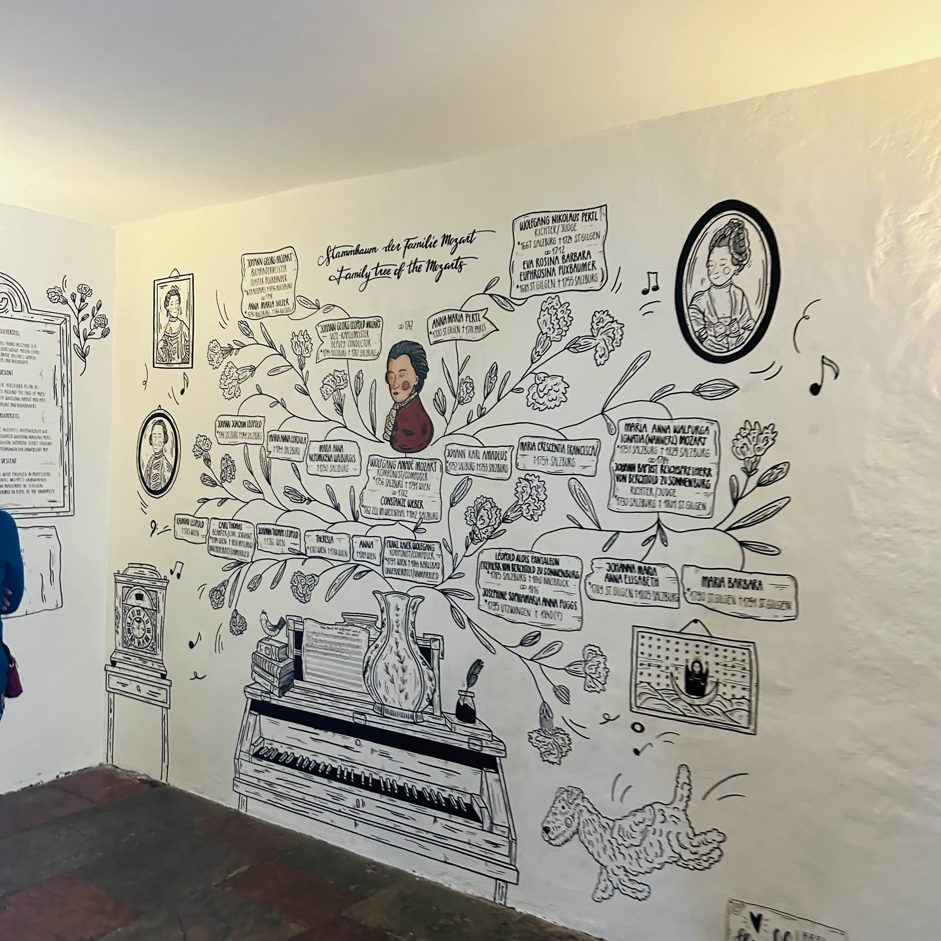 모짜르트 생가도 입장권이 필요해요! 입구에 매표소가 바로 있어서 현장구매하고 올라갔습니다. 13,50 유로면 거의 2만원정도 한다고 보면되요! 음악의 도시를 갔으니 한번쯤 구경 해봐야겠다고 생각이 들어서 들어갔어요! 사실 관광지는 크게 볼게 없지만 자주 올 수 없는 곳이다 보니 구경하게됬습니다. 모짜르트의 가족 초상화와 설명이 나열되어있고 층별로 구경할 수 있도록 되어있습니다.